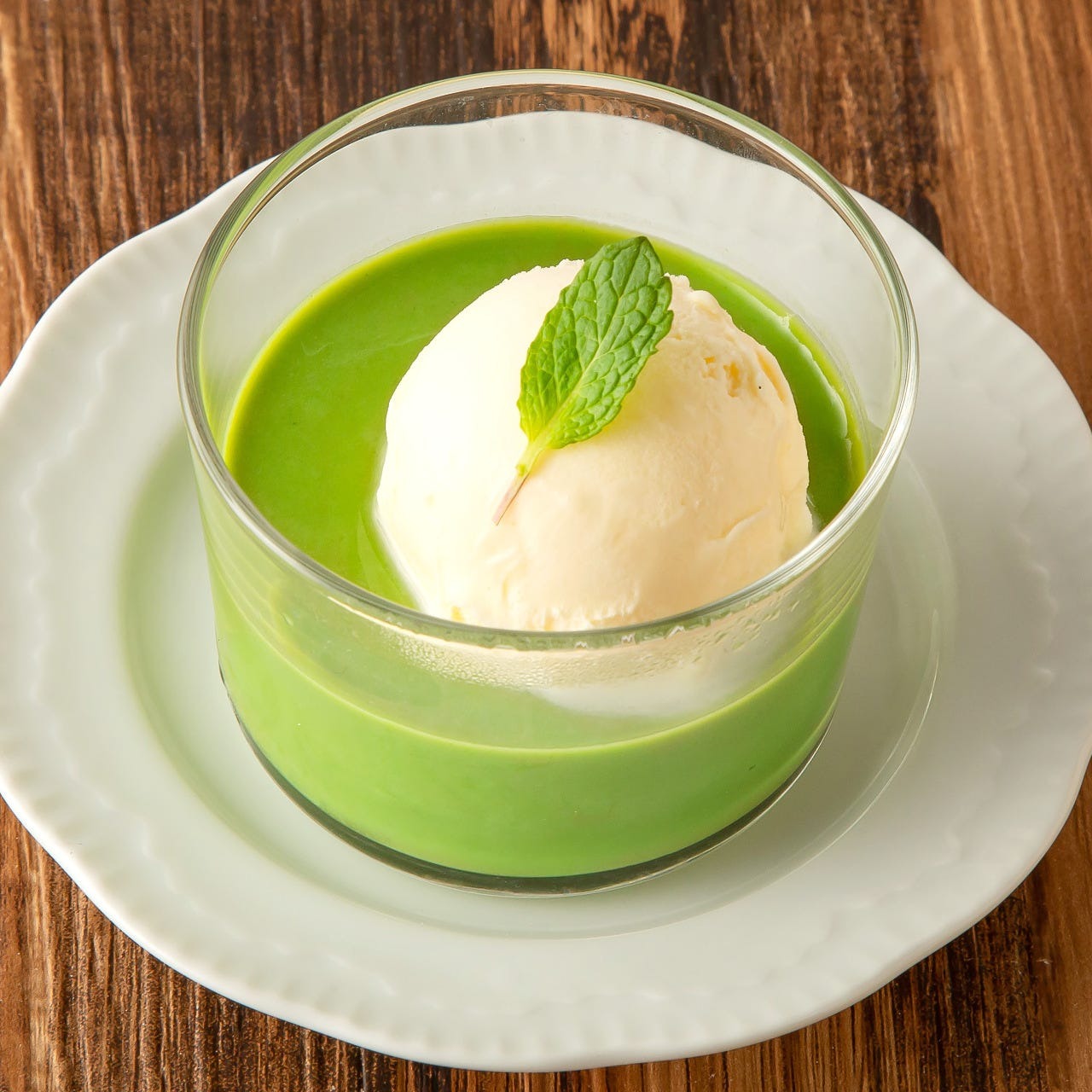 写真のメニューは「抹茶ホワイトチョコレートプリン バニラアイスのせ」です。抹茶のグリーンとバニラアイスのホワイトのコントラストが美しい一品。ホワイトチョコレートの上品な甘みがお口直しにぴったりのメニューとなっています。